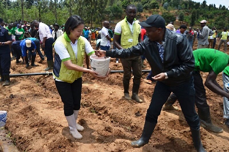 After the visit to Mwogo TVET, Rt hon Ngirente, proceeded to Mwogo marchland where he officiated the launching of agricultural season 2019A, he participated in plantation of Maize seeds, whereafter he has met with famers users of the marshland and the neighboring residents, wh asked them to use profitably this agricultural technology, to strive to always look clean, to pay for health insurance and to avoid conflicts especially among the cooperative members.